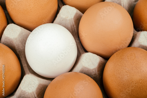 White egg surrounded by brown eggs. Individuality and difference