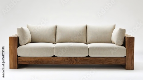 White Fabric Sofa with Wooden Frame and Three Pillows