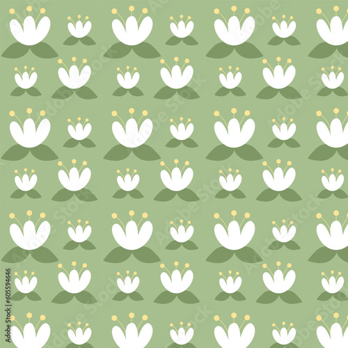 White flowers isolated on green background. Hand drawn floral seamless pattern vector illustration.