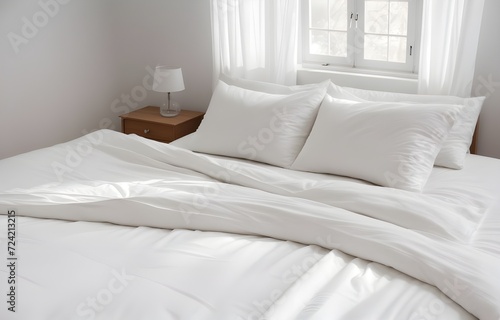 White folded duvet on white bed. household, domestic activities, hotel and home