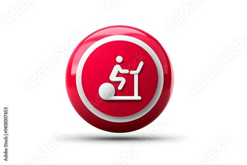 White glowing icon of a fitness machine and human figure inside a red circle on a white background