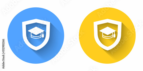 White Graduation cap with shield icon isolated with long shadow background. Insurance concept. Security, safety, protection, protect concept. Circle button. Vector