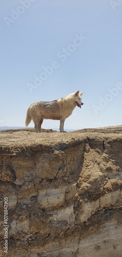 White husky standing on a rocky cliff, covered in dirt after a swim, with tongue out, under a clear blue sky. The Dead Sea mountains background
