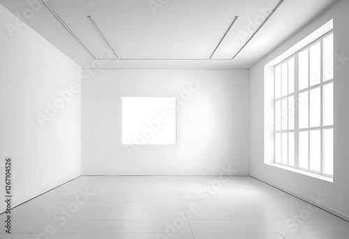 White interior with large windows and canvas, creating a modern, minimalist space