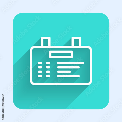 White line Airport board icon isolated with long shadow. Mechanical scoreboard. Info of flight on the billboard in the airport. Green square button. Vector.