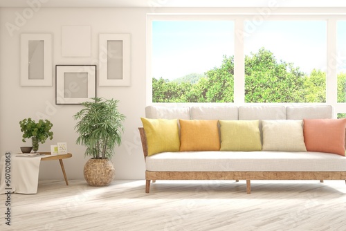 White living room with sofa and summer landscape in window. Scandinavian interior design. 3D illustration