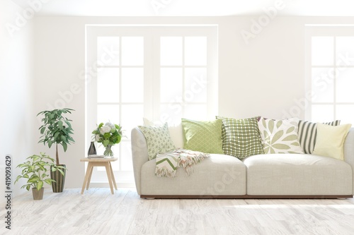 White living room with sofa. Scandinavian interior design. 3D illustration