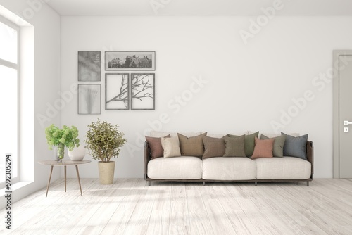 White living room with sofa. Scandinavian interior design. 3D illustration