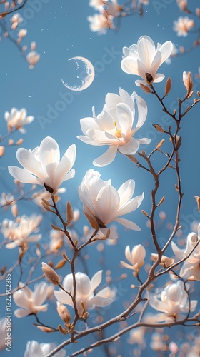 White magnolia flower under blue sky poster background