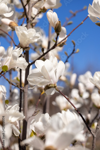 White magnolia flowers blooming on branches against blue sky