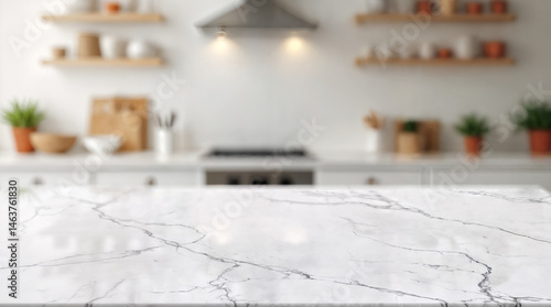 White marble texture table top on blurred kitchen background