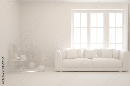 White minimalist living room with sofa. Scandinavian interior design. 3D illustration