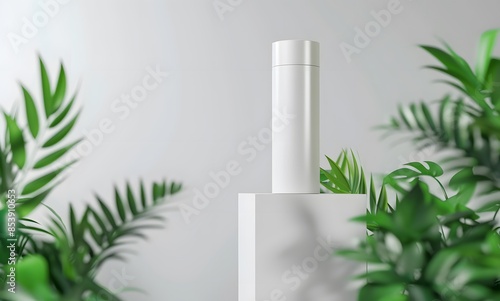 White mockup tube standing on top of an abstract podium with green leaves in the background, symbolizing natural beauty products