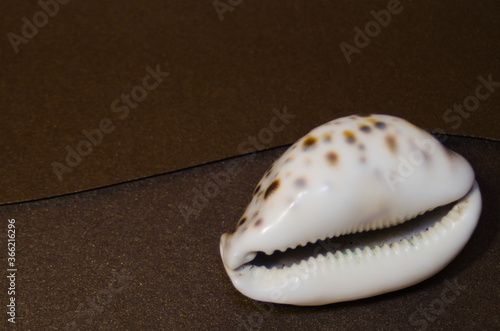 white mother-of-pearl shell with dark round spots on the surface against the background of a dark envelope made of thick paper