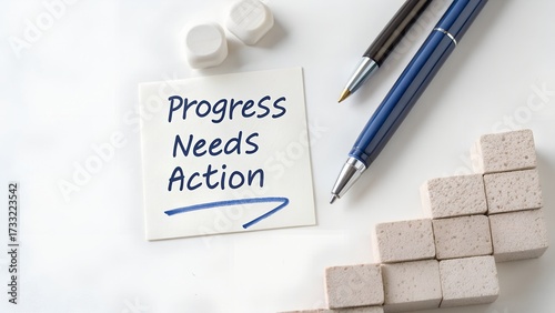 White notepaper with Progress Needs Action written with blue pen