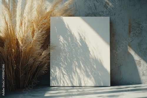 White Panel with Pampas Grass and Light Patterns on a Grey Wall