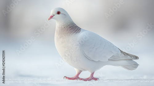 White pigeon standing in snow, side profile, red eyes, pink legs.