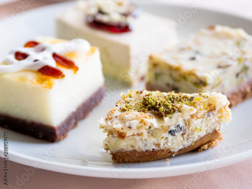 White plate full of different pastries. Tasty desserts with topping, pistachios.