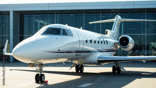 White private jet parked on tarmac near a modern glass building with blue tinted windows under bright sunlight
