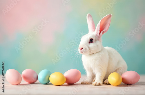 White rabbit and colorful eggs on a multicolored pastel background, free space for text, Easter background.