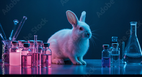 White Rabbit in Laboratory with Vials and Glassware animal research