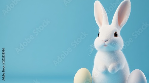 White rabbit is sitting on top of an egg. The rabbit is looking at the camera with a curious expression. The image has a playful and lighthearted mood, as it depicts a cute