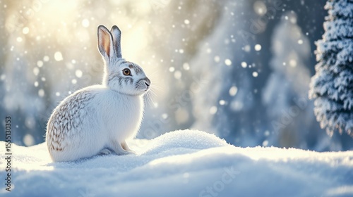 White rabbit sitting in snowy winter forest, sun shining.