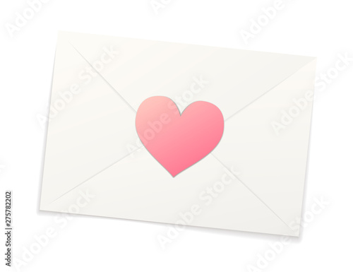 White realistic paper envelope with pink sticker in heart shape on white