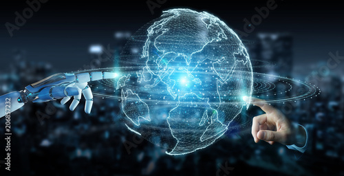 White robot hand using globe network hologram with America Usa map 3D rendering