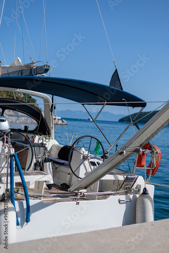 White sailboat docked at a marina on a sunny day