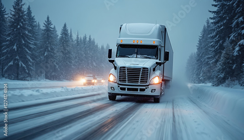 White semi-truck drives snowy road during heavy snowstorm, blizzard conditions, swirling snowflakes. Winter transportation on icy highway, dramatic weather with motion blur. Cold, hazardous,