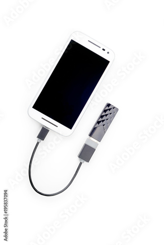 White smartphone connected to a black USB key with an OTG cable. Isolated on white background