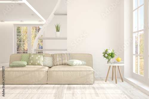 White stylish minimalist room with sofa. Scandinavian interior design. 3D illustration