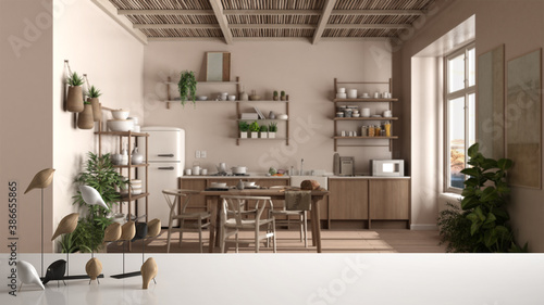 White table top or shelf with minimalistic bird ornament, birdie knick - knack over blurred country rustic kitchen, dining table, chairs, shelves, appliances, modern interior design