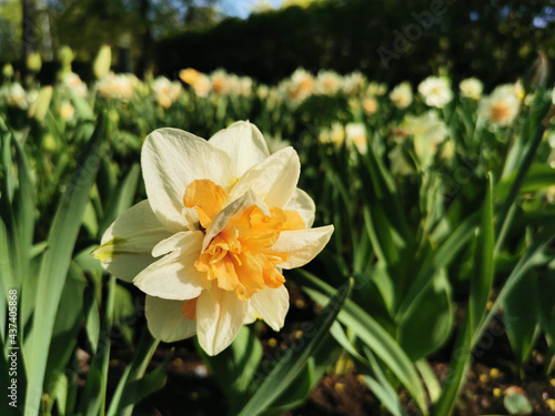 White terry daffodil with an orange center in green leaves. The festival of tulips on Elagin Island in St. Petersburg.