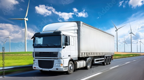 White Truck Driving on Highway with Wind Turbines in Background