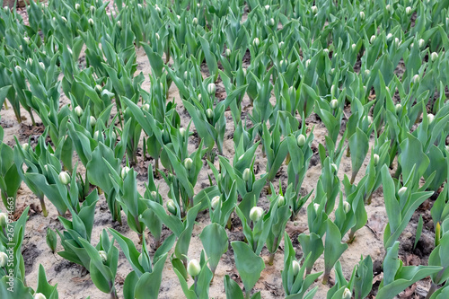 White unblown tulips in the garden shortly before flowering. Young green leaves of tulips. Growing flowers on the field in early spring