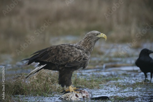 White-tailed Eagle or Sea Eagle (Haliaeetus albicilla) perched on a fish in shallow water