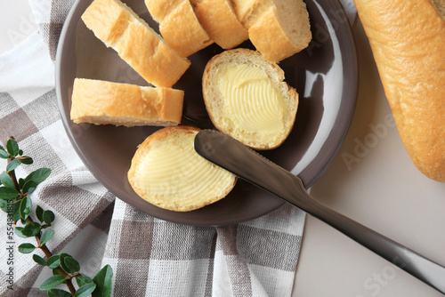 Whole and cut baguettes with fresh butter on table, flat lay