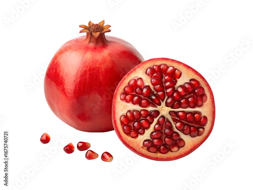 Whole and halved ripe pomegranate with scattered seeds isolated on transparent background