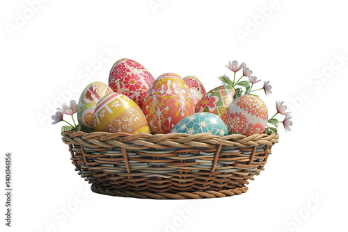 Wicker basket filled with colorful decorated eggs and small white flowers