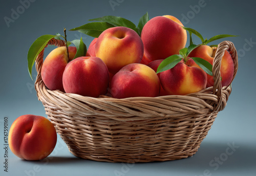 Wicker basket filled with ripe peaches and green leaves on neutral background, warm natural light highlighting soft fuzzy skin and vibrant orange red color