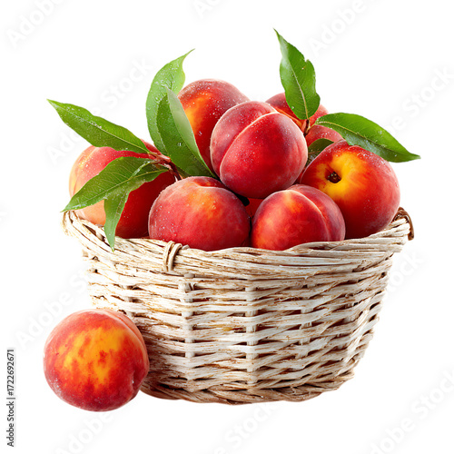 Wicker basket filled with ripe peaches isolated on transparent background