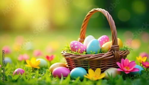 Wicker basket overflowing with colorful Easter eggs nestled in a vibrant flower field , spring holiday, celebration