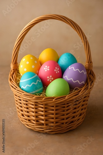 Wicker Easter basket filled with painted eggs