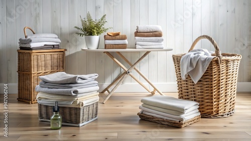 Wicker laundry baskets with clean folded clothes and towels, next to a ironing board and a stack of fresh linens, on a white wooden floor.