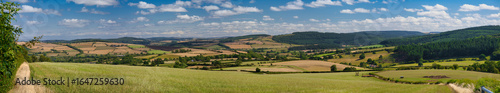 Wide panoramic view of patchwork fields and rolling hills under blue skies in the Shropshire Hills National Landscape, Shropshire, UK. Bright summer light and fluffy clouds convey a fresh rural feel.