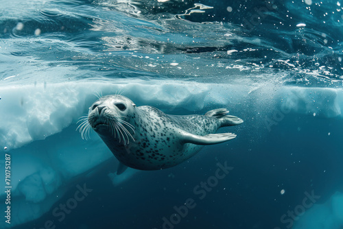 wide shot Under water Seals swim beneath the Arctic sea ice
