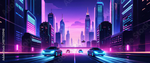 Wide view illustration of a futuristic city street at night with glowing neon lights, skyscrapers, and electric cars driving on the road in dark blue and violet color palette