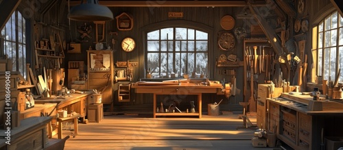 Wide view of a workshop with various saws, hammers, and planes, organized